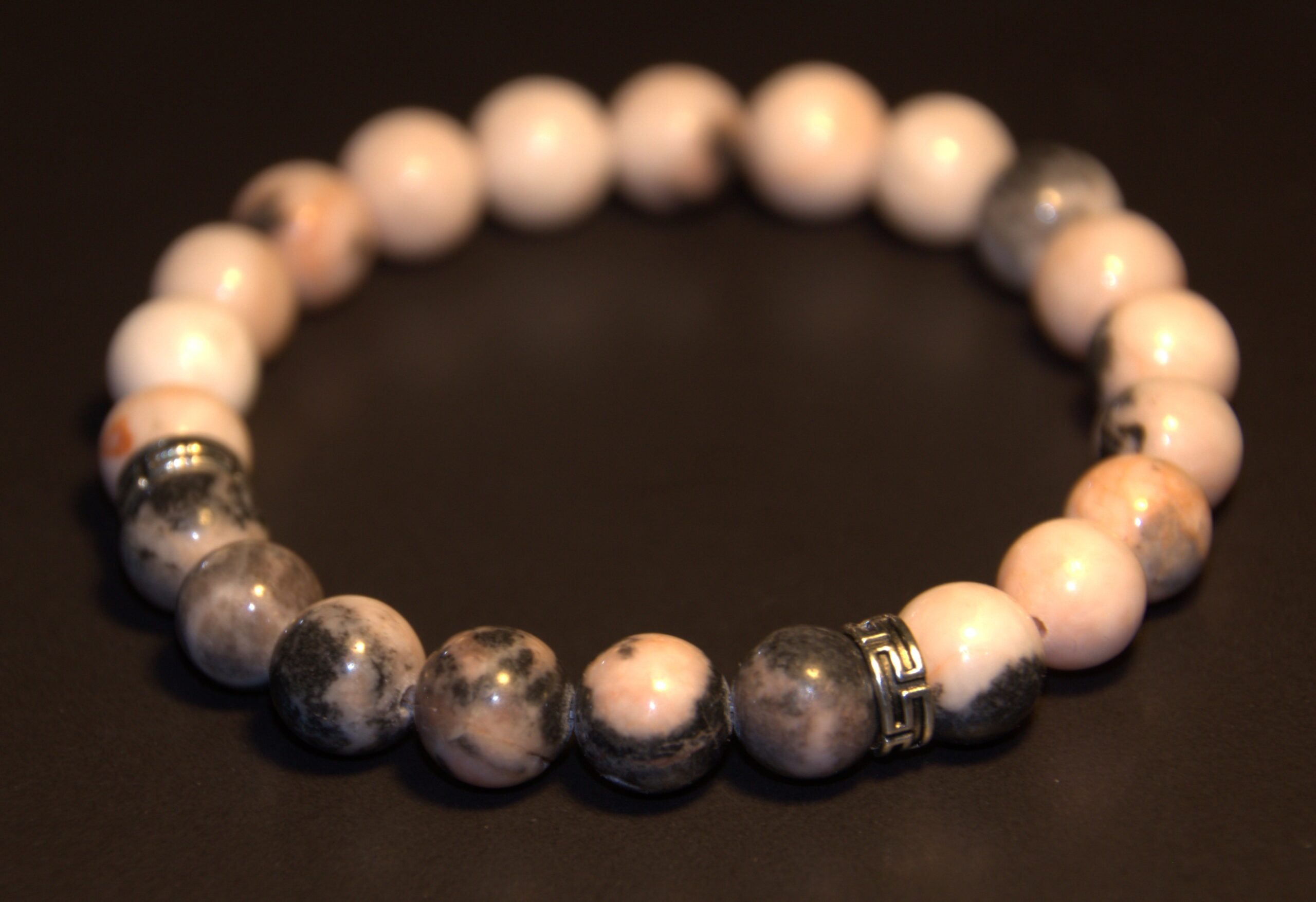 8mm Natural Honed Pink Zebra Jasper, features soft tones of pink and dark grey, accompanied by an antique silver accent – to accomplish this attractive and selected look.